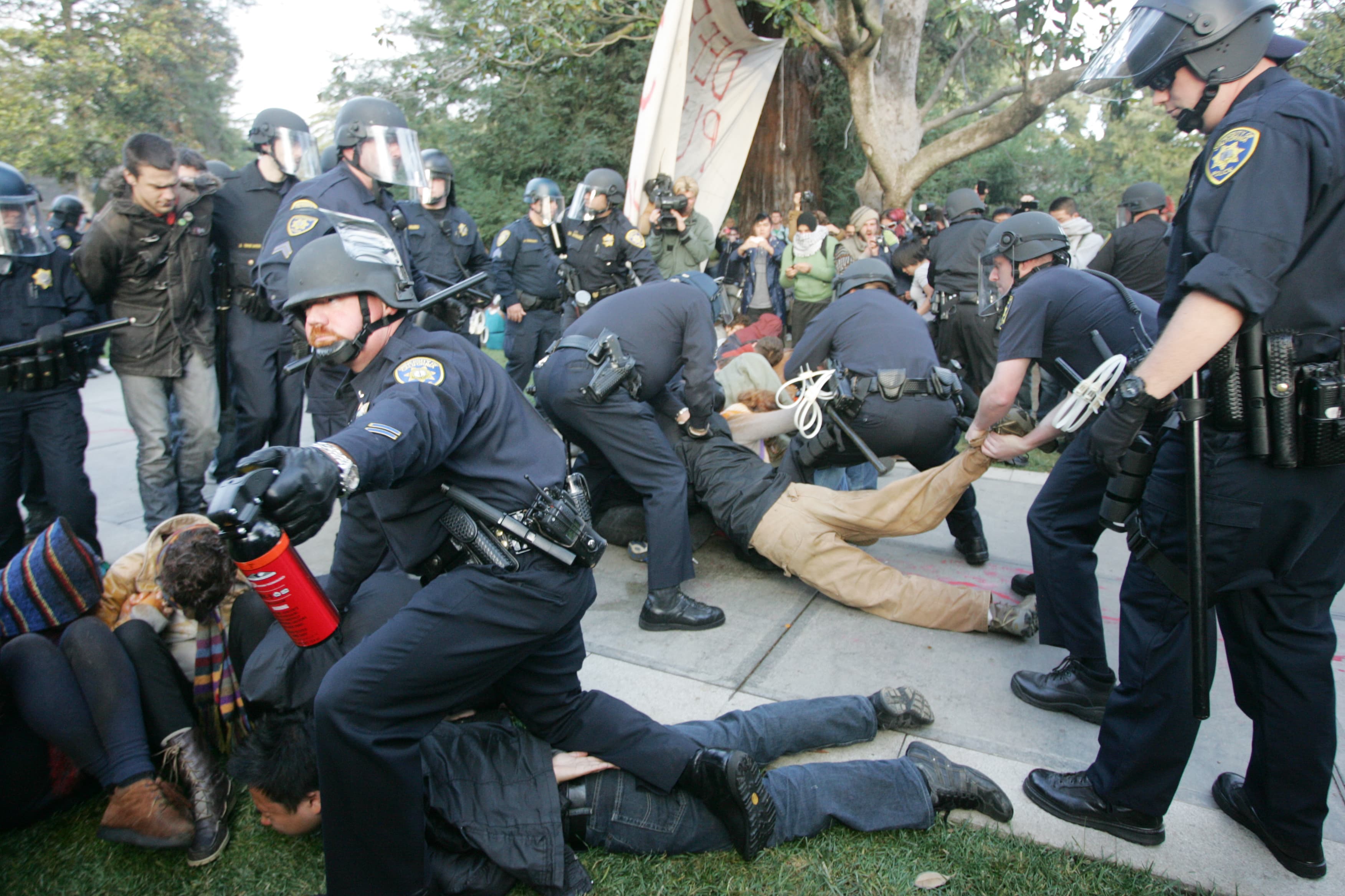 Student protesters just faced off with UC Davis campus police on the Quad. At approximately 3:30 p.m., police officers marched to the protesters. After protesters refused to leave, police arrested at 10 individuals, nine of which were students. Officers also pepper-sprayed students in the face who were sitting down and linking arms.