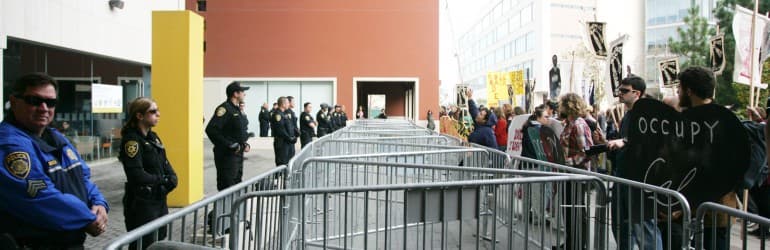 According to the Daily Californian, during the meeting, about 10 protesters stood up from the audience in the conference building and began chanting, bringing the discussion to a temporary halt. After a few minutes, the demonstrators moved outside to join the larger group of protesters after campus police threatened to arrest them.
