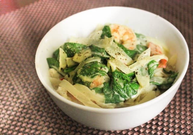 Next, add in baby spinach. You don’t want to add the spinach in too early, because it only takes 1-2 minutes to wilt down.