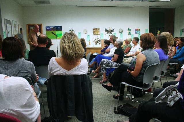 At Stories on Stage Davis readings, guests gather in the Pence Gallery in downtown Davis. The event features works by both an established, often widely-published author and an emerging author (two authors altogether) whose future in prose-writing looks promising. Having both an emerging and established authors’ stories read provides a twist on an already acclaimed work as well as a stage for up-and-coming writers.