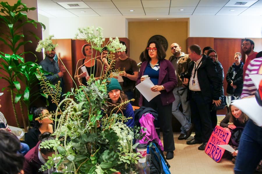The protesters made their way across campus from the Memorial Union to Mrak Hall, where they sat in the Office of the Chancellor demanding Katehi’s resignation. They also called for her replacement to be selected and approved by UC Davis students and workers. The demonstrators taped resignation forms across the office walls and chanted phrases such as “Rain or shine, Katehi must resign” and “Katehi, you’re fired.”