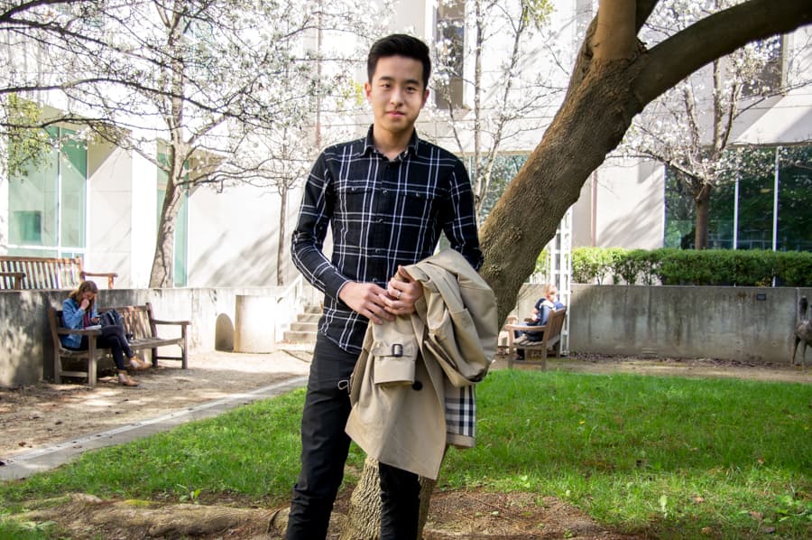 Jiarong told us that his two staple pieces are his Burberry trench coat and Dr. Marten boots. These articles of clothing may be a bit pricier but they’re well worth the investment. As you can see in these pictures, Jiarong’s outfit is extremely versatile and works for a variety of different occasions. He is able to wear this outfit when it’s chilly because the trench coat provides him enough warmth. But he also wears this outfit when the sun is out because his pants and shirt are made out of a light, breathable material. And, because Jiarong invested in timeless, high-quality pieces like his coat and boots, he will be able to wear this outfit for years to come.
