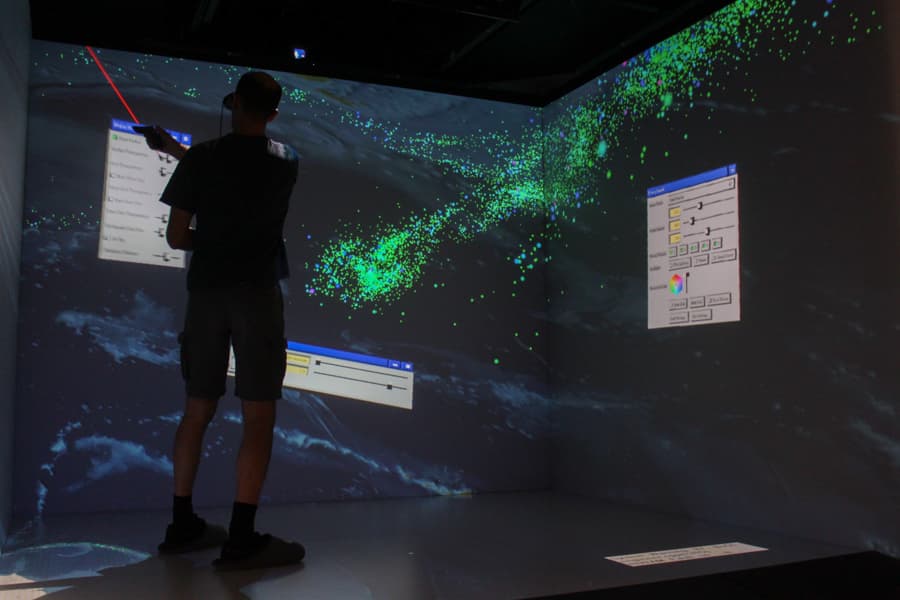 Behind the screens of the CAVE is an elaborate system of electrical equipment, including six computers and four projectors. Images of objects and geographical settings are projected onto the screens, and when viewed with a pair of StereoGraphics CrystalEyes shutter glasses, the projections appear as 3D, hologram-like models that can be analyzed and manipulated through the use of a wireless controller.