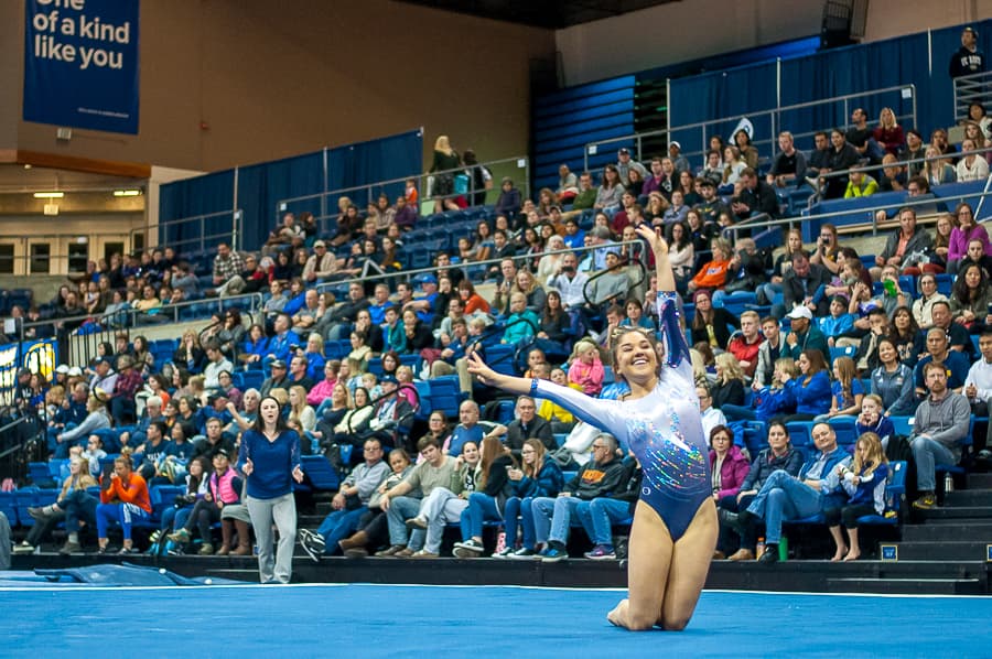 The Pavilion was electric with excitement for the Aggies as they continued into their second rotation at the uneven bars. Senior co-captain Yonni Michovska had a particularly exciting performance complete with impeccably executed handstands and a solid dismount, landing her a career-best score of 9.875. Her efforts, along with her teammates’ collective performances on the bars, totaled 48.750 and escalated the Aggies score to 97.325 halfway through the meet, leaving them just .025 points behind BSU’s first-place 97.350.