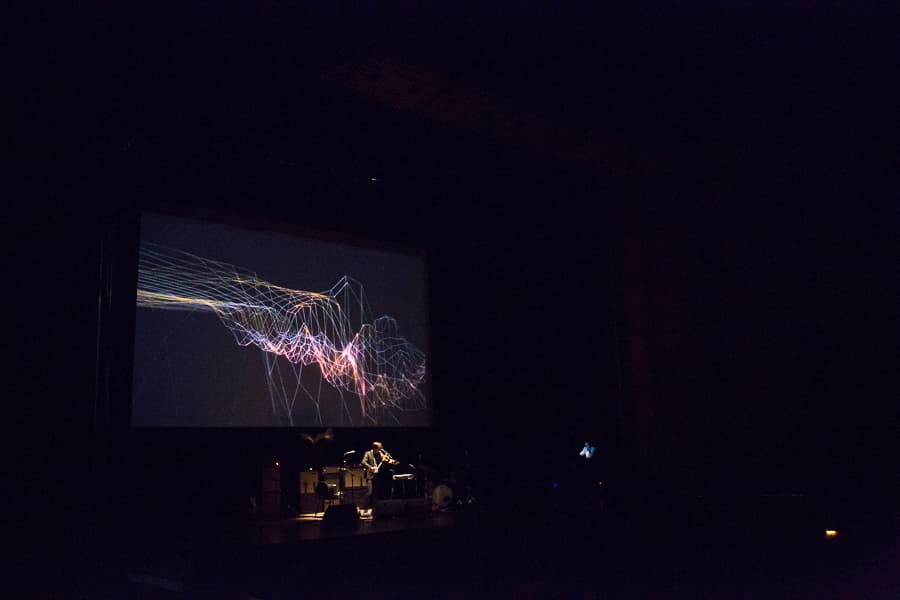 A series of short films were projected behind Bird as he played. The films, titled “Echolocations,” consisted of Bird playing songs from his instrumental album of the same name in various locations such as the Los Angeles River and Coyote Gulch in Utah. The films combined real-time shots with scenes of a linear topographical map of the area in which Bird was playing, creating a psychedelic experience.