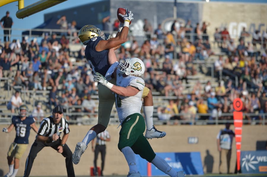 The game kicked off in the middle of an unusually warm October afternoon. But the temperature did not interfere with the UC Davis offense, which found the endzone on each of its first three possessions. In fact, the Aggies scored on just the third play from scrimmage, when sophomore quarterback Jake Maier completed a 24-yard pass to his wide-open sophomore tight end, Wesley Preece. Maier found Preece streaking up the seam again, off a similar play-action fake, on the next UC Davis possession. The 28-yard hookup completed a two-play drive and was Preece’s second touchdown on the afternoon, putting the Aggies up 14-0 after only three minutes of play. Preece finished with five catches for 96 yards, garnering praise from head coach Dan Hawkins.