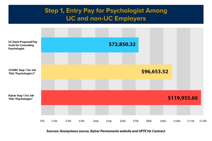 At a local healthcare provider such as Kaiser, the job title “psychologist” has a pay range of $119,955 to $155,764. UPTE has presented UCOP with a step scale structure of pay ranges for counseling psychologists reflective of local markets. Each UC campus has a different salary structure it is presenting.
