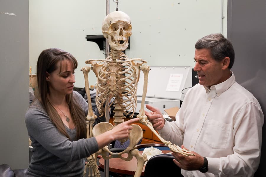 Plasse points out that it’s a common misconception that the class is made up of mostly pre-medical students, and that yearly surveys show that only about 18 to 19 percent of the students intend to go into medicine. In fact, this course isn’t too far off from the anatomy class medical school students have to take.