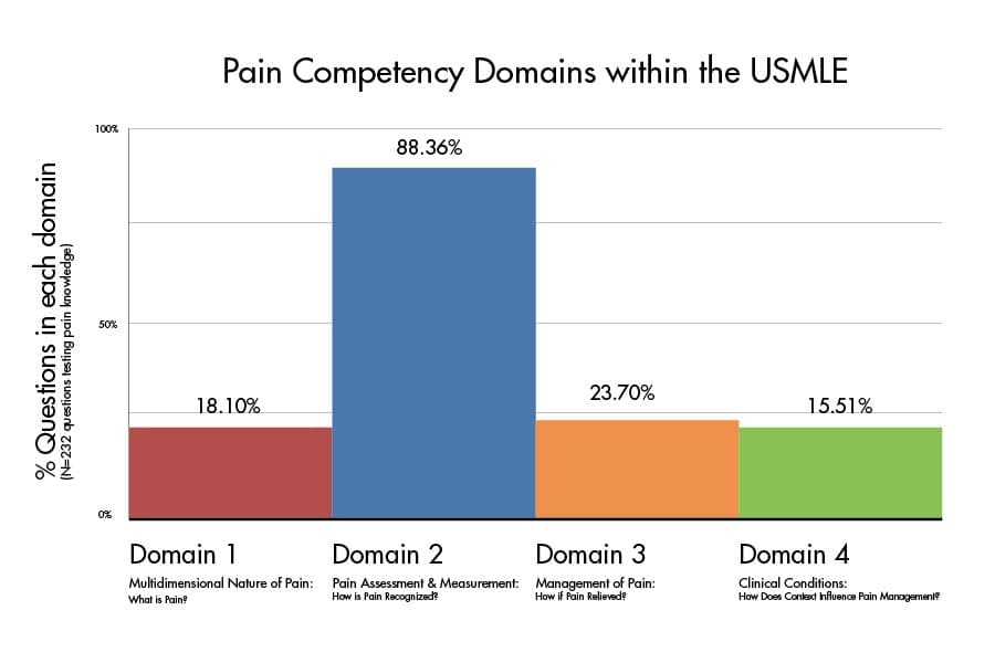 The 2018 analysis of pain-related questions on the USMLE used these core competencies to organize and keep track of where the exam’s questions were focused. After a group of raters in secure conditions reviewed 1,506 questions from four randomly selected exams, it was discovered that 28.7 percent of the questions included the word “pain.”