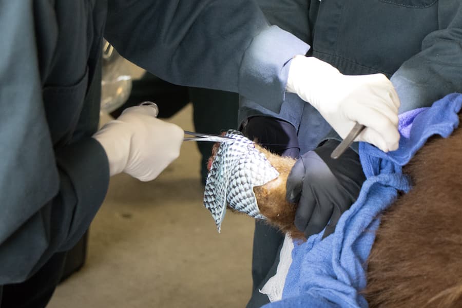 “Wildlife is a little different than treating a dog or a cat because you can’t hold them like a dog or a cat, actually to do anything with you them you have to anesthetized them,” Peyton said. “The other thing is that you can’t bandage their feet like you would [with a dog or a cat], because if they eat it, it’s a problem and if they tear it off, you can’t go into their pen and easily get it out. We had to figure it out, using traditional methods of burn care. So the creams that we use for pain control, cleaning the wounds, and then add other things.”