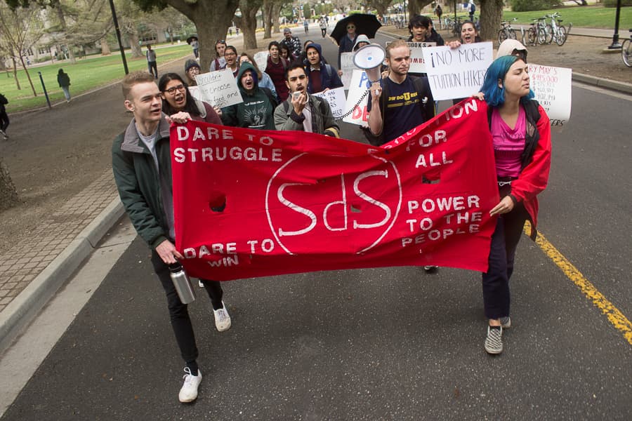 Around 20 protesting students then marched toward the Memorial Union. Along the march, they chanted slogans expressing their displeasure with the UC Regents.