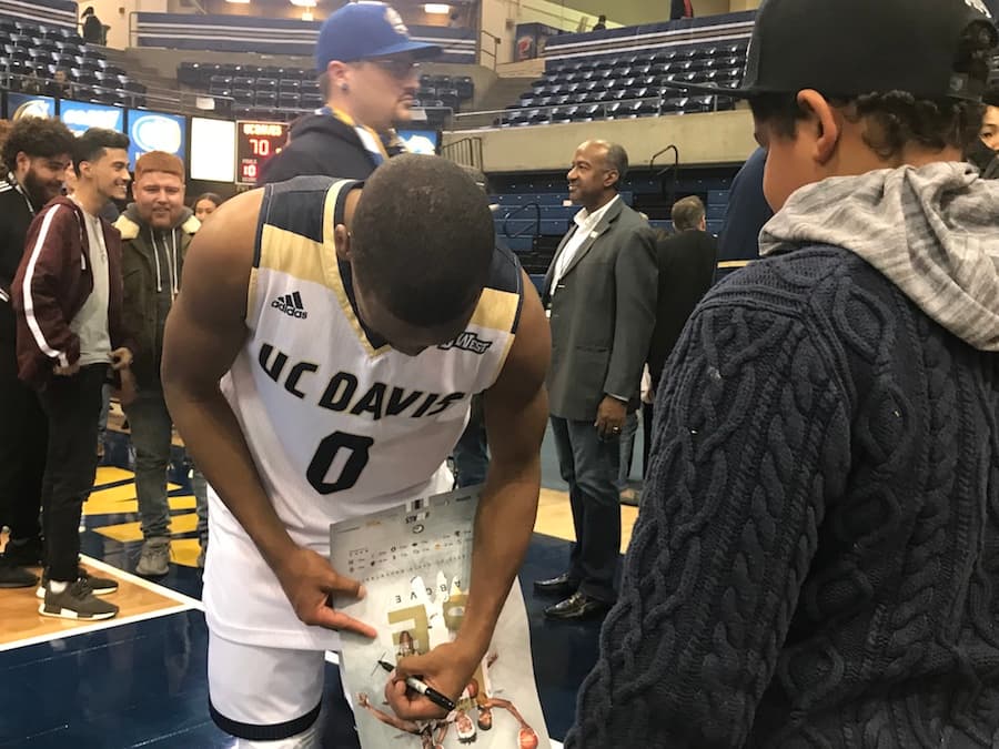 After consulting the boys at Progress Ranch and Activity Coordinator Leola Taylor, the group chose the final home game against Hawai’i for the special event. The students also coordinated with Kristin Moore, assistant director of athletics marketing. The boys then had the opportunity to watch the game in reserved seats and afterwards got autographs from the UC Davis men’s basketball team.
