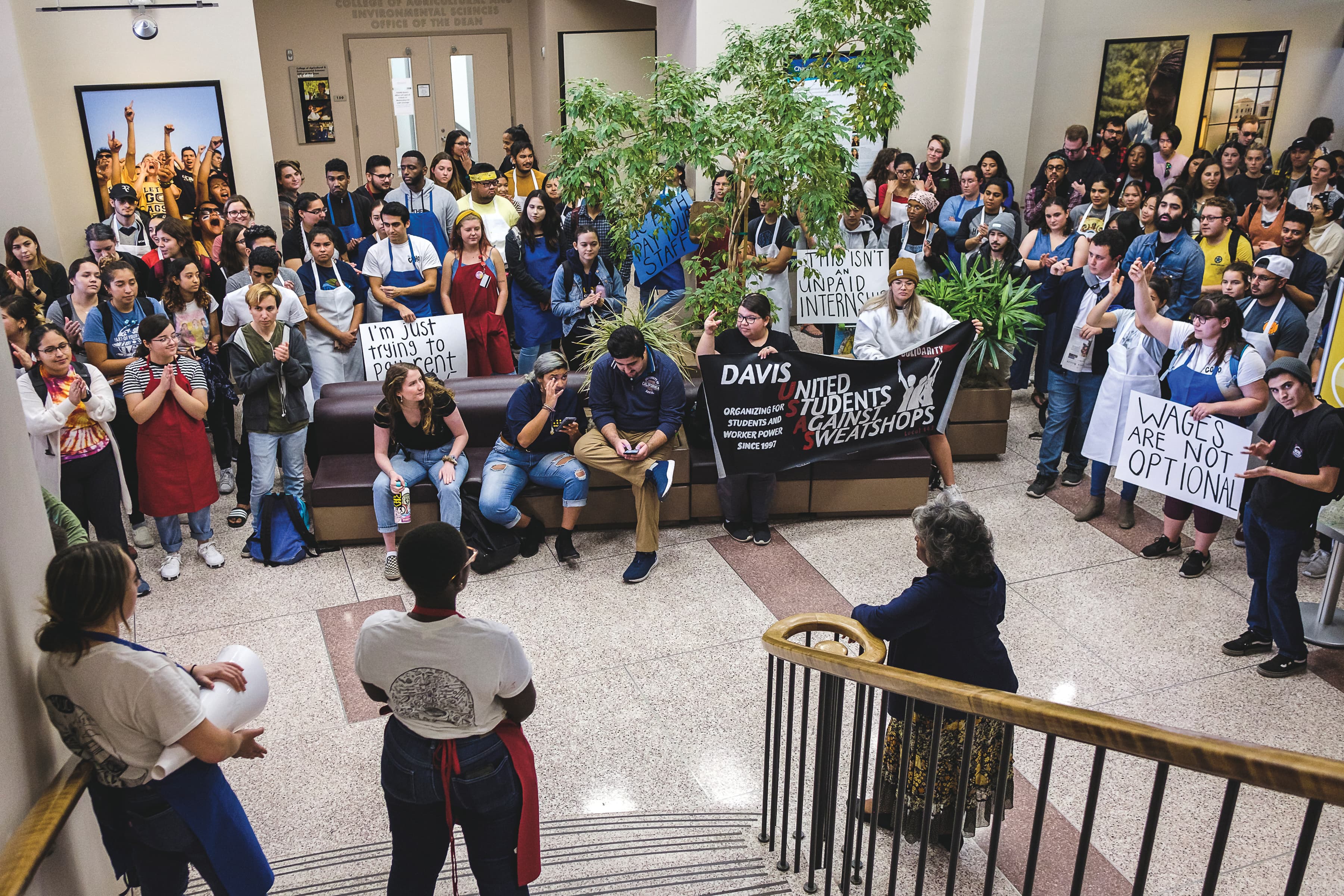 Students made their way to Mrak Hall, the building that houses the UC Davis administration offices. Emily Galindo, the interim vice chancellor for Student Affairs, came downstairs to talk to the students who were shouting and chanting their complaints. She stated that out of the 3,000 students employed by Student Affairs, the majority of them are getting paid.
