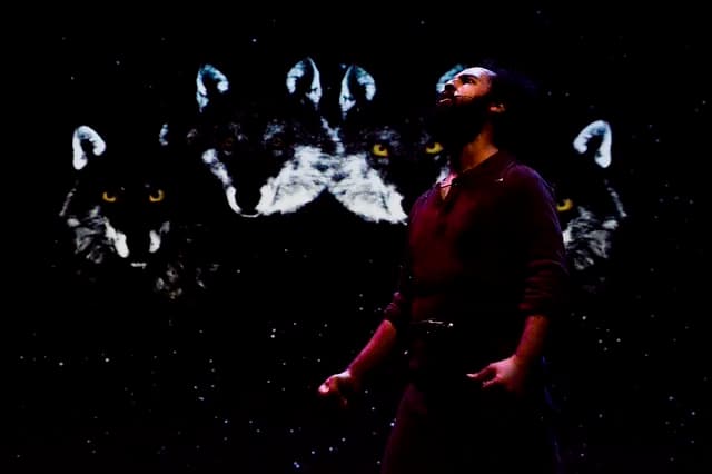 Theater collective Theatre Heroes seeks to keep this story alive and tell it in an innovative way in their touring production “Call of the Wild: Illustrated Edition.” The performance is a one-man show, with a single actor telling the story amid a minimal set of just two boxes against a background of three large electronic screens with various imagery.