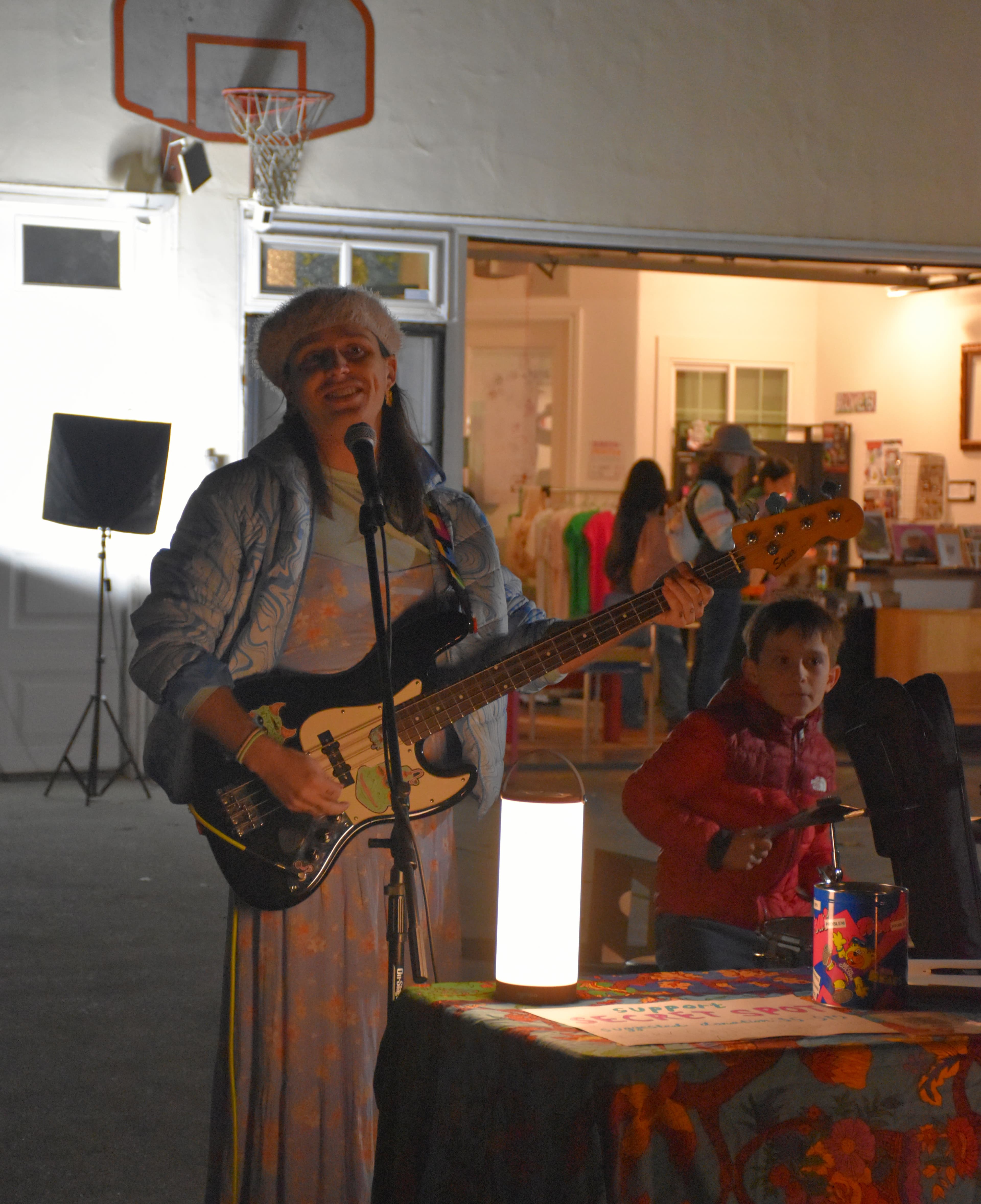 Far from the silence typically associated with art galleries or museums, Secret Spot buzzed with excitement. People laughed and chatted as they roamed the studio. Visitors joined in with Greer playing a drum and bass set, filling the venue with lively music.