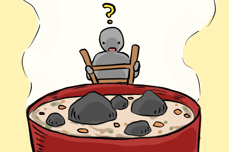 Slowly but surely, the pot began to be filled with veggies from the student farm and chicken stock from The Pantry — someone even tried to put a wild turkey into the pot before Gunrock intervened. When Gunrock wasn’t looking, a group of geology majors slipped some stones into the soup, claiming that rocks make every meal taste better. As the makeshift soup simmered, Gunrock would stir occasionally with a large wooden spoon.