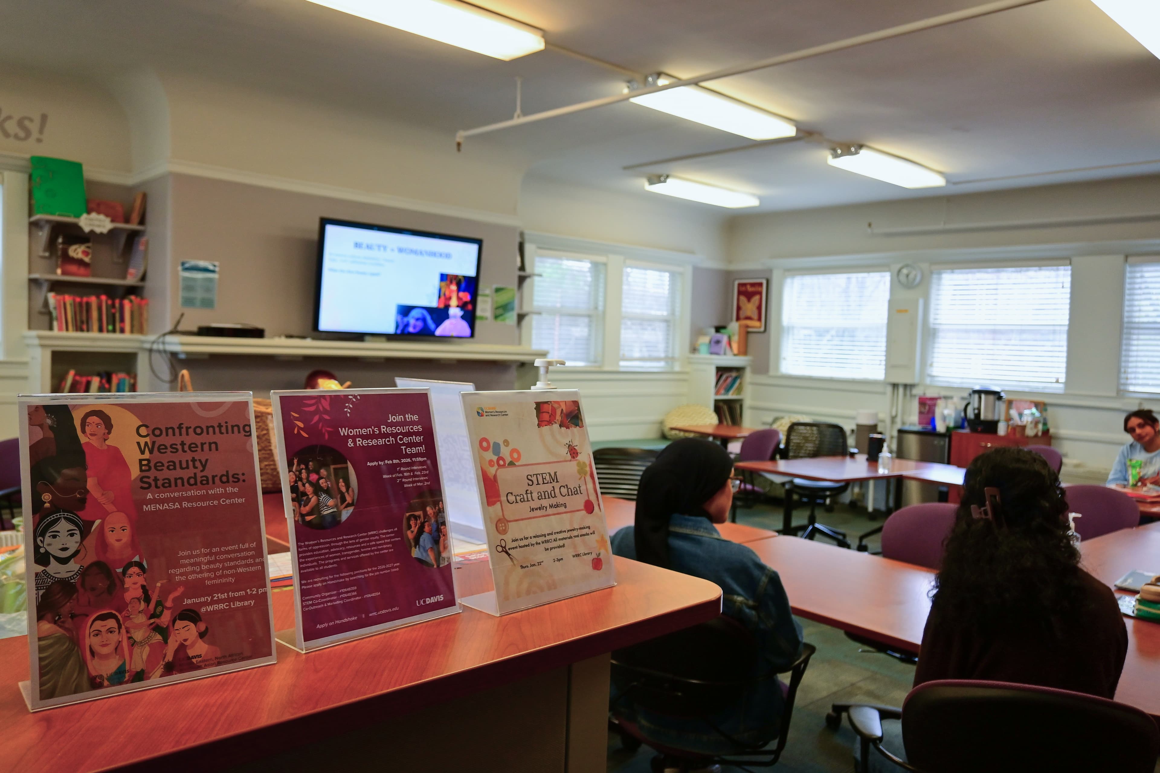 Signs for the Middle Eastern, North African and South Asian (MENASA) Resource Center’s “Confronting Western Beauty Standards” event in the Women’s Resources and Research Center on Jan. 21, 2026. (Julia Heron-Watts / Aggie)