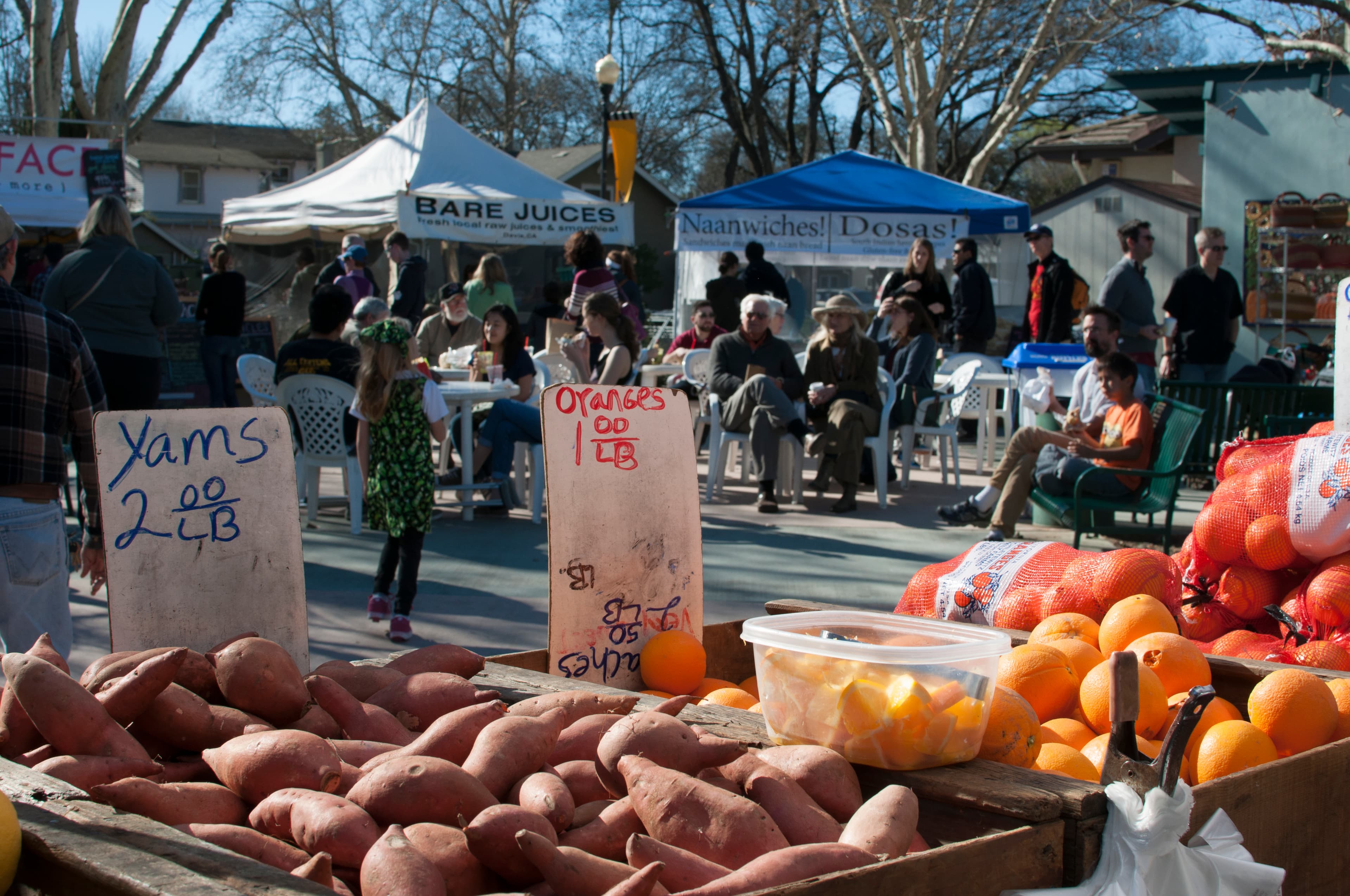 Vendors at Davis Farmers Market share information about food production with customers